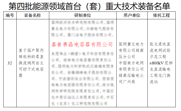 近日,国家能源局公布了第四批能源领域首台(套)重大技术装备,其中388vip太阳集团成员-嘉善赛晶电容器有限公司参与的“基于国产聚丙烯粒料的柔直换流阀用自主可控干式电容器”成功入选,此次入选不仅是对388vip太阳集团在技术研发和产品创新方面的肯定,更是对其在推动能源装备国产化进程中所做出的突出贡献的高度认可。
