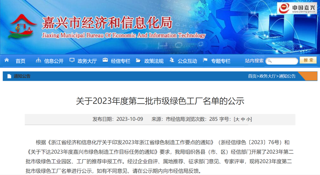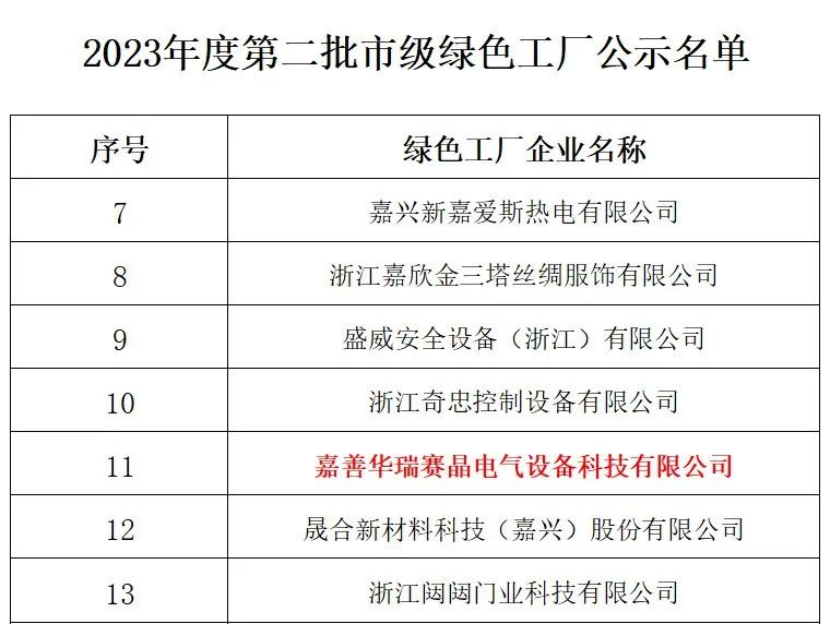 浙江省嘉兴市经济和信息化局日前公布了《2023年度第二批市级绿色工厂》的公示名单,388vip太阳集团成员企业 嘉善华瑞赛晶电气设备科技有限公司荣誉上榜,获评“绿色工厂”称号。这是对赛晶坚持践行“以科技创新,推动绿色能源发展”的认可与肯定,更是全方位彰显了赛晶的“绿色智造实力”。