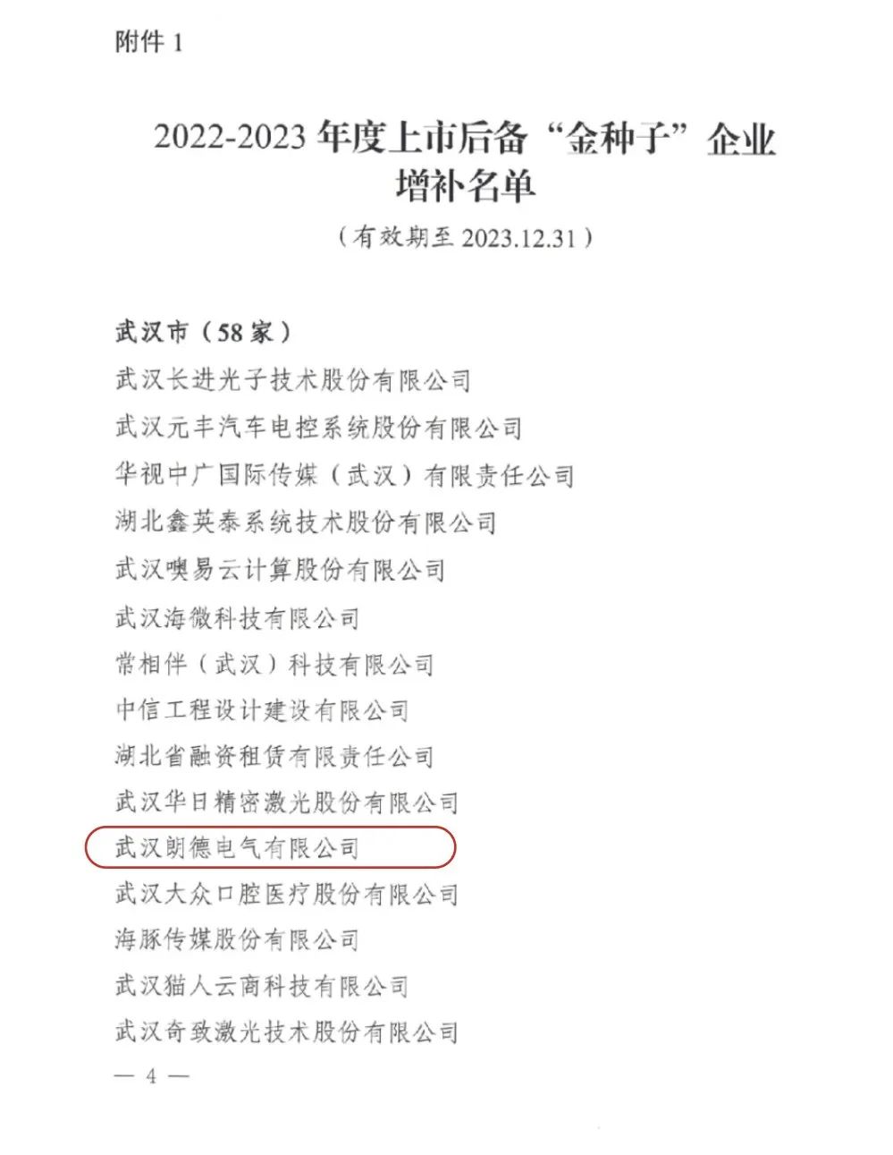 近日,湖北省企业上市工作领导小组办公室公布2022-2023年度湖北省上市后备“金种子”企业名单,新增149家“金种子”中,来自武汉的有58家,经过推荐与评选,388vip太阳集团成员企业-武汉朗德电气有限公司(以下简称:朗德电气)成功入选名单。