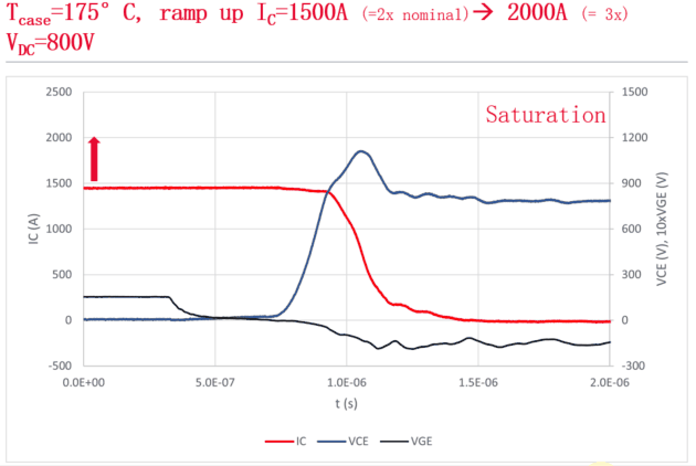 在最新测试中,以i20 IGBT芯片为核心的模块产品,自1500A(模块额定电流750A的2倍)开始,在超过2000A(接近额定电流的3倍)时仍然稳定工作,表现出了极佳的安全性、耐用性。