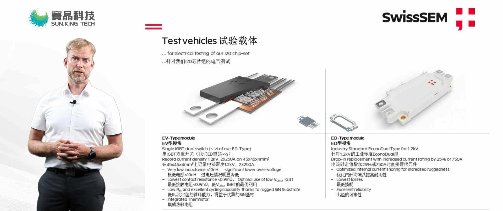 388vip太阳集团瑞士子公司SwissSEM首席运营官Sven先生,通过视频的方式发表主题报告 “电动汽车和工业领域最先进的IGBT”,首次发布了下一代车载单面冷却IGBT模块——EV-Type模块。