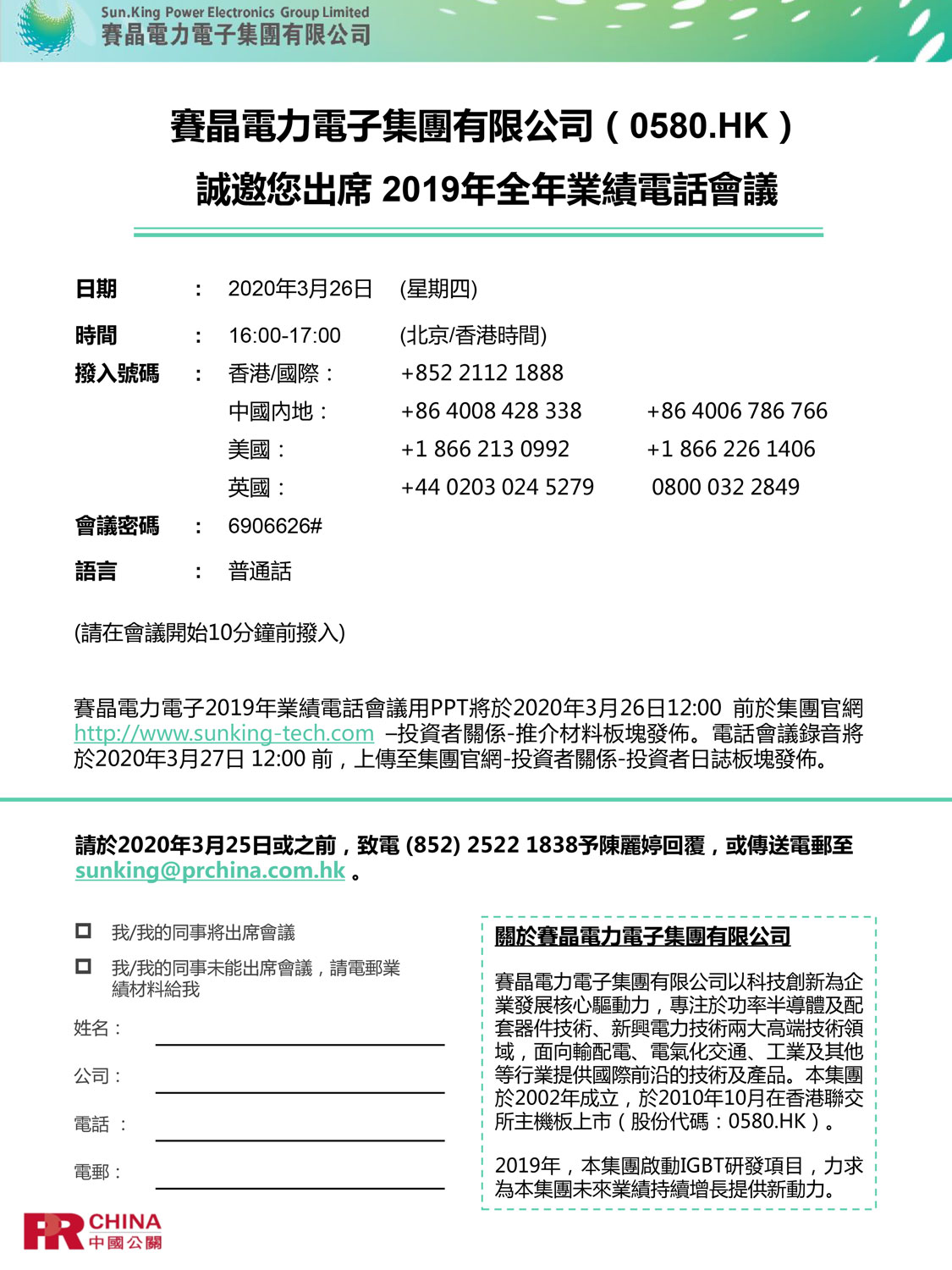 赛晶电力电子集团有限公司(0580.HK),将于2020年3月26日 16:00-17:00 召开2019全年业绩电话会议。