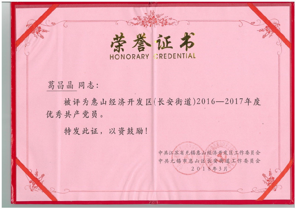 此外,本次会议上获奖的还有:无锡赛晶电力电容器有限公司设备副经理葛昌晶荣获惠山经济开发区(长安街道)“2016-2017年度优秀共产党员”荣誉称号,质量部主管宋萍萍荣获惠山经济开发区(长安街道)“2016-2017年度先进生产工作者”荣誉称号。
