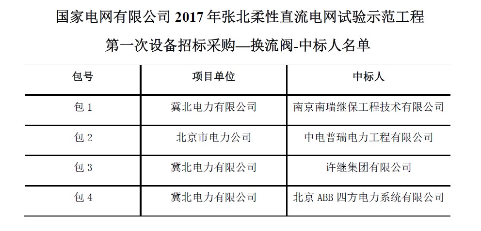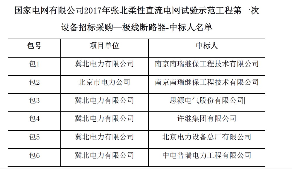 3月30日,国家电网公司发布2017年张北柔性直流电网试验示范工程第一次设备招标采购中标公告。其中,南京南瑞继保工程技术有限公司、思源电气股份有限公司、许继集团有限公司、中电普瑞电力工程有限公司等中标了高压直流断路器(极线断路器);南京南瑞继保工程技术有限公司、中电普瑞电力工程有限公司、许继集团有限公司等中标了换流阀。