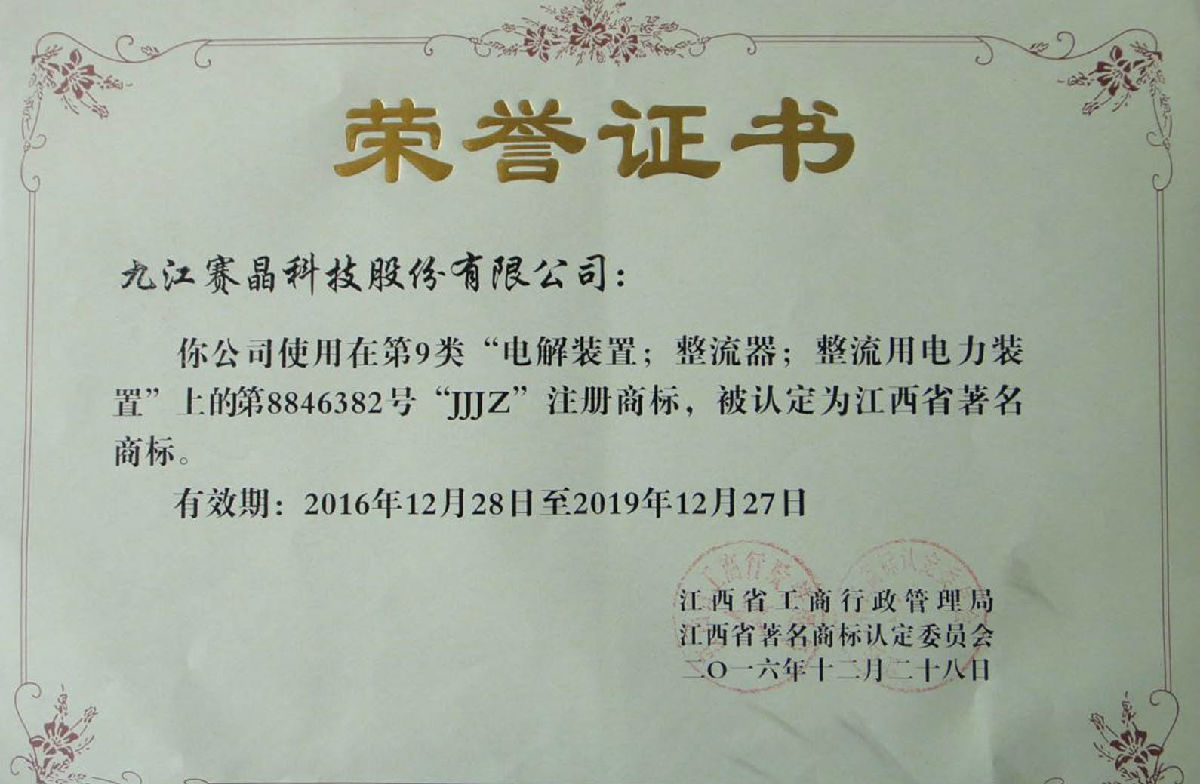 2016年12月28日,经江西省工商行政管理局、江西省著名商标认定委员会评审通过并正式公布,九江388vip太阳集团的注册商标“JJJZ”被正式认定为“江西省著名商标”。
