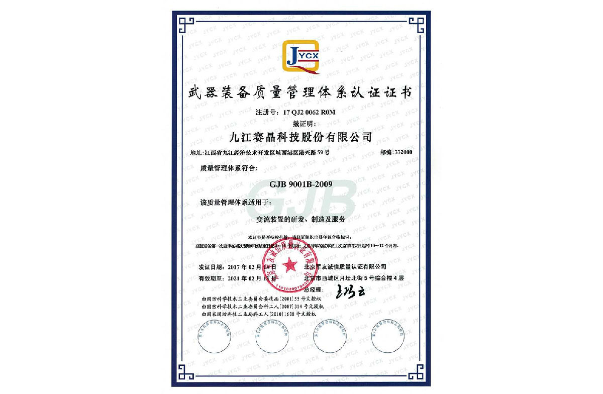 2016年11月29日,顺利通过认证公司关于GJB9001B-2009质量体系审查工作,并于2017年2月14日获得了GJB9001B-2009质量管理体系认证证书。该认证证书的取得,表明公司生产专项产品的质量管理体系符合承担军品任务的相关要求,是公司获得的一项重要军工资质,具有非常重要的现实意义。
