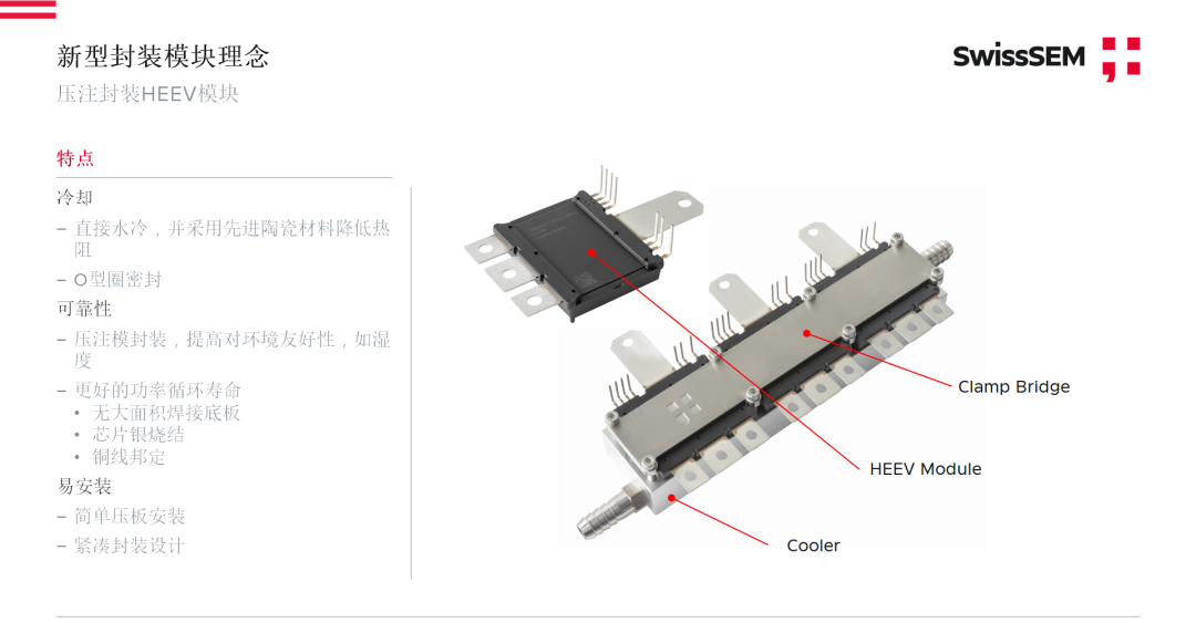 HEEV封装SiC模块具有低杂感、体积小等特点,采用压注封装且一改经典串联水冷模式采用并联无底板设计大大提高了其散热效率,能够将SiC芯片的性能得到更充分的发挥,助力客户实现高达250kW最紧凑电驱的实现。