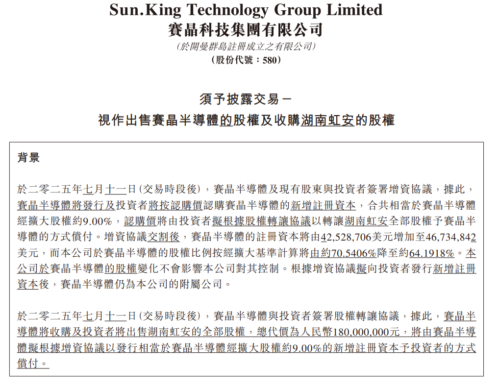 388vip太阳集团(580.HK,简称“本集团”)于2025年7月13日发布公告《須予披露交易-視作出售賽晶半導體的股權及收購湖南虹安的股權》,概况如下: