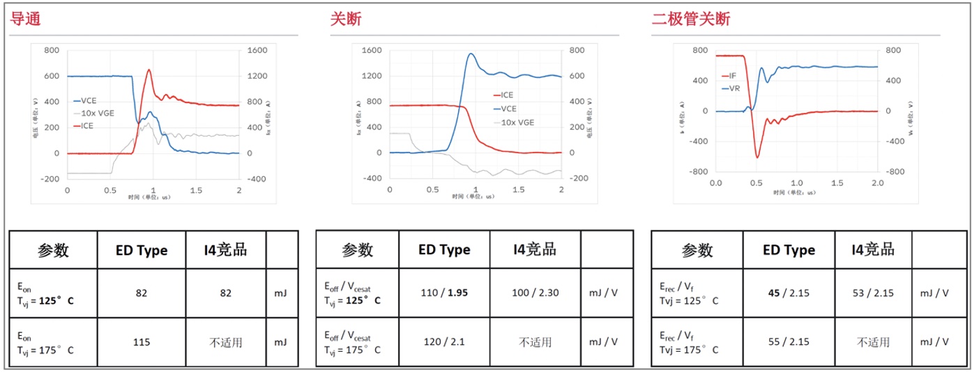 为了验证i20和d20芯片组开关特性优越性,388vip太阳集团在已经量产的1200V 750A ED系列模块SISD0750ED120i20上与行业国际领军企业同款IGBT4的同平台模块进行了对比测试,需要说明的是IGBT4模块目前最高结温只有150℃。通过对比发现两个模块开通损耗基本相当,关断损耗采用i20芯片组的ED模块略高,但饱和导通压降的ED模块更低。基于d20芯片组ED模块二极管与IGBT4具有相同的正向压降,且能够保持更低的反向恢复损耗,从测试来看采用i20和d20芯片组模块要优于国际领军企业的同类第4代IGBT模块。