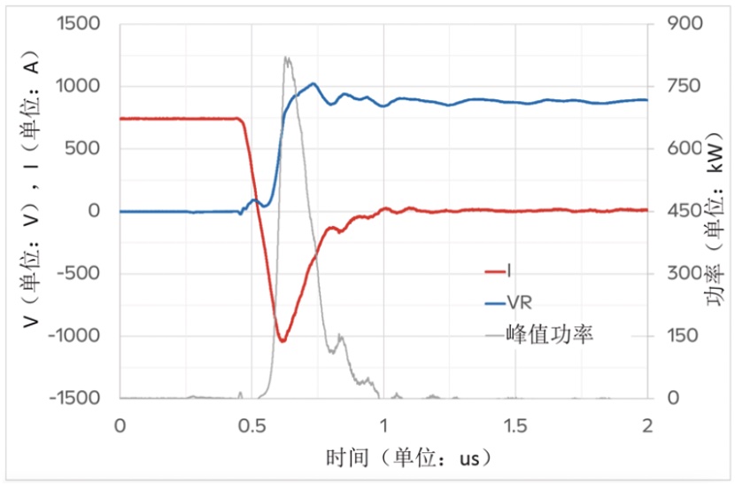二极管的安全工作区主要取决于二极管的开关特性。为了评估二极管的稳健性,通过将外部栅极电阻Rgon减小到最小值,然后增加栅极电压Vge,从而提高二极管的换向速度。对于选定的极端情况:750A的电流和900V的反向电压,IGBT开通电压21V,进行双脉冲测试。实验发现:在175°C的外壳温度下,二级管的峰值功率超过800kW,di/dt超过10kA/us,器件依然可以稳定。选定的测试条件远远超出了任何数据表建议,进一步体现了388vip太阳集团d20芯片组的高可靠性。