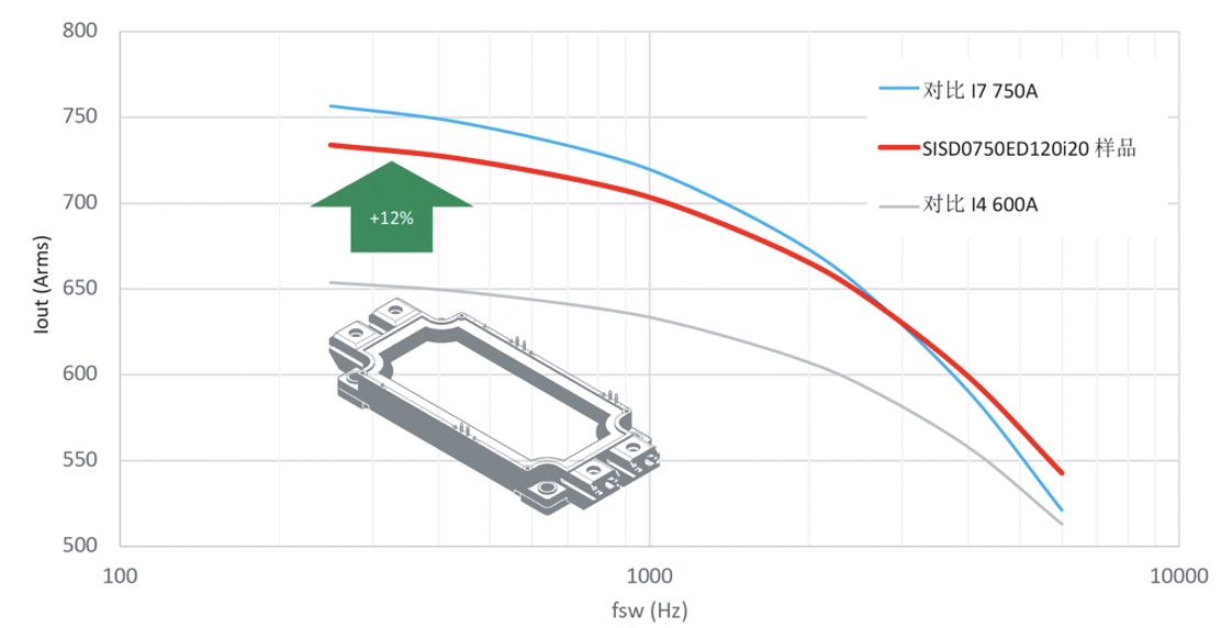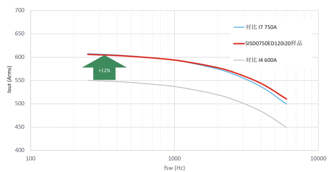 为了在系统应用层面验证i20和d20芯片组的性能,将基于i20芯片组的ED型750A半桥模块与竞争对手i4-600A和i7-750A两款模块分别在整流模式和逆变模式进行了对比仿真。性能曲线图反映了逆变器输出功率(或电流)与开关频率的关系,仿真热阻值取自数据表,而器件的静态和动态损耗取自测量值。逆变工况下,ED-750A额定模块在最坏的情况下比最先进的i7 740A模块功耗低3%,当开关频率直到3kHz时达到平衡。而与目前应用居多的i4-600A模块相比,ED型模块能够提升超过10%的性能。在整流器模式下,388vip太阳集团ED模块的性能与最新的i7-750A模块基本一致,相比i4-600A模块相比,性能同样可以提高10%以上。