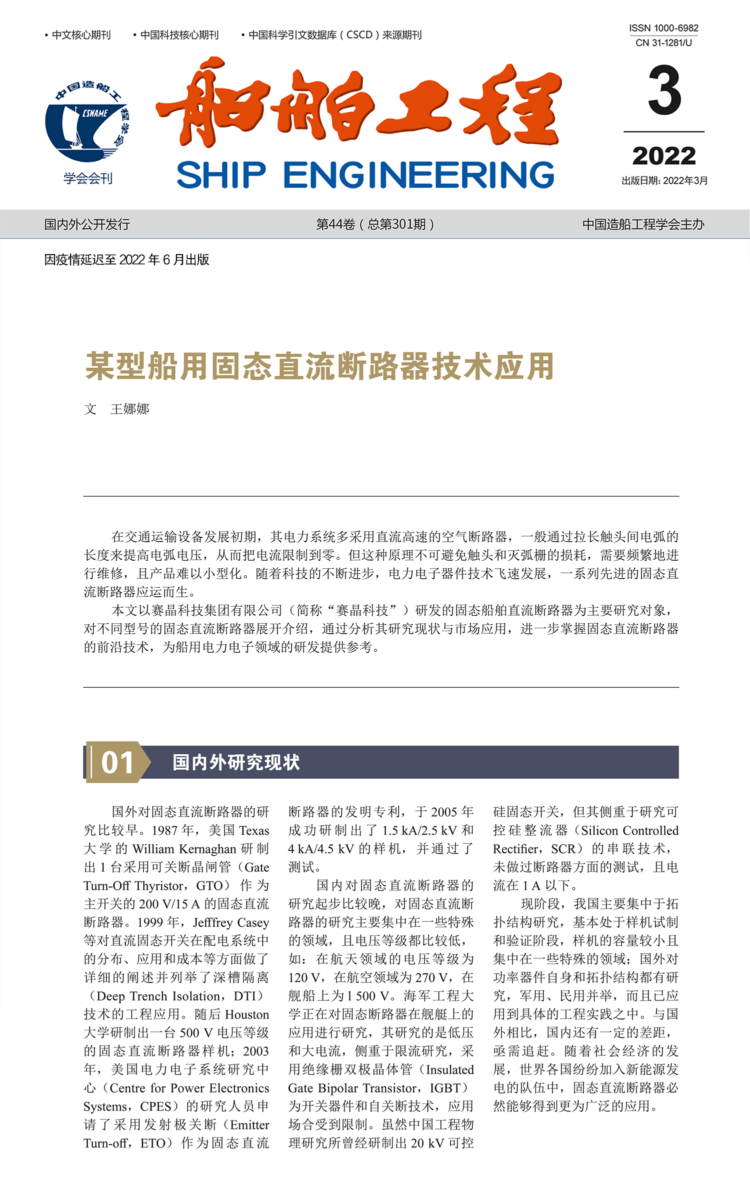 国家核心期刊《船舶工程》刊登专题文章《某型船用固态直流断路器技术应用》,介绍了国内外船用直流断路器的工作原理和发展现状。该文以赛晶船用固态直流断路器为研究对象,阐明了在该领域前沿技术创新和探索中,赛晶取得的出色成果;例举了赛晶产品的技术特点和优势,以及国际市场中取得的实用业绩。